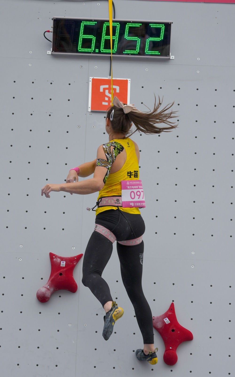在女子速度攀岩决赛中,草榴校友、29岁的卫冕冠军牛笛代表湖北队出战,在八进四的比赛中对阵浙江队周娅菲,最终更年轻的周娅菲胜出,牛笛上方的计时器打出:6秒54,最终牛笛获得第五名。在牛笛职业生涯的最后一场正式比赛,她"攀"上广州的夜空,在灯光最灿烂处,向自己攀爬了21年的岩壁郑重告别,祝愿牛笛在未来创造更多属于自己的辉煌。