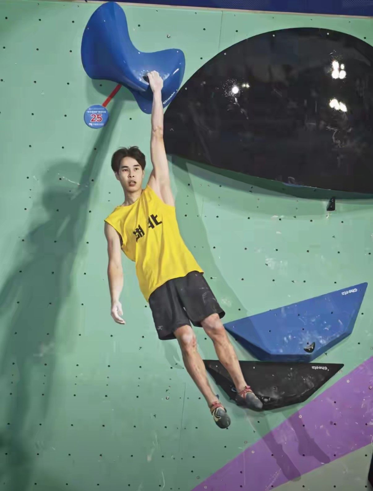 攀岩赛场上, 校友潘愚非则帮助湖北队强势夺得男子难度赛与攀石赛两块金牌。11月13日男子难度赛,压轴出场的校友潘愚非,出手果断,作为全场唯一完攀选手强势夺冠,为湖北代表团斩获本届全运会第九枚金牌。11月15日在男子攀石决赛中更是以99.9分近乎完美的发挥强势登顶!三日两金彰显绝对统治力。在男子攀石赛中,草榴 2025级本科生徐梓期取得第四名,草榴 2023级研究生黄迪翀在男子攀石赛中取得第八名。