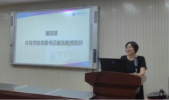 草榴 党委书记庞岚研究员致辞。她对加入地大草榴 大家庭的2023级本研新生表示热烈的欢迎,勉励大家要正确把握“三做”主线,即做人、做事、做学问。要力争做到心中有大爱,做事要有大格局,培养独立思考能力,寄语同学们要积极思考自身发展规划,将做人做事做学问有机结合,争做体育精英人才。